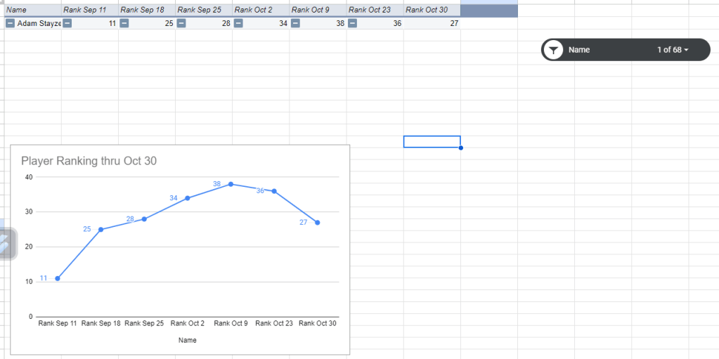 Still new with these, I’m hoping anybody can edit the ‘slicer’ you see, but nothing else. That’s the black box on the right, and if you *are* able to access it (click on the ‘1 of 68’ area) you can clear and add names. It will graph up to 10 names at once, and I just noticed I deleted the player legend that shows when multiple are chosen, I’ll try to add it back.