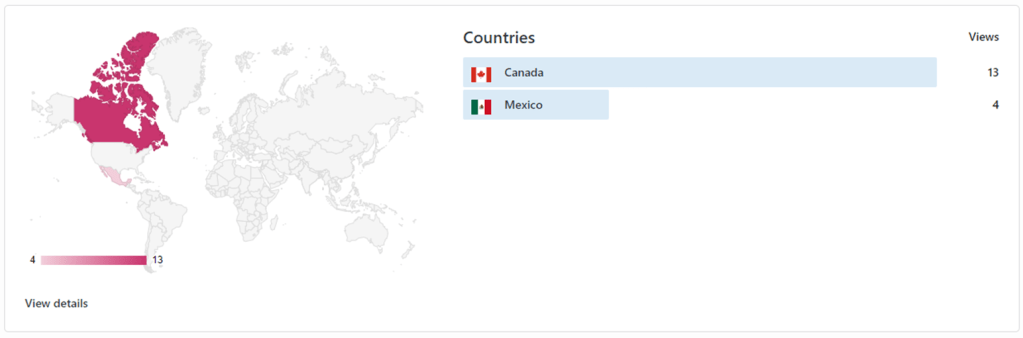 First off – is someone on a lovely vacation in Mexico tying to check their stats? I hope you’re not in Acapulco… This is view stats for gmdl.ca by country: