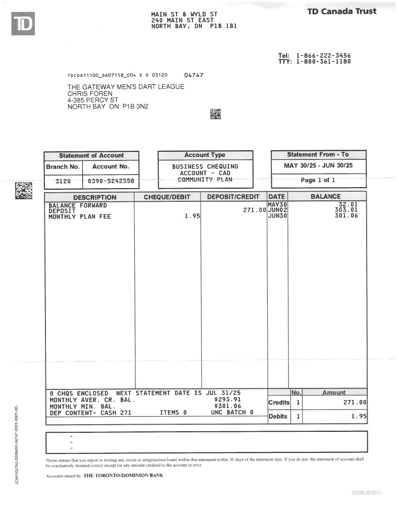 Deposit Slip (League Fees – 10/12) – Oct 2 2024